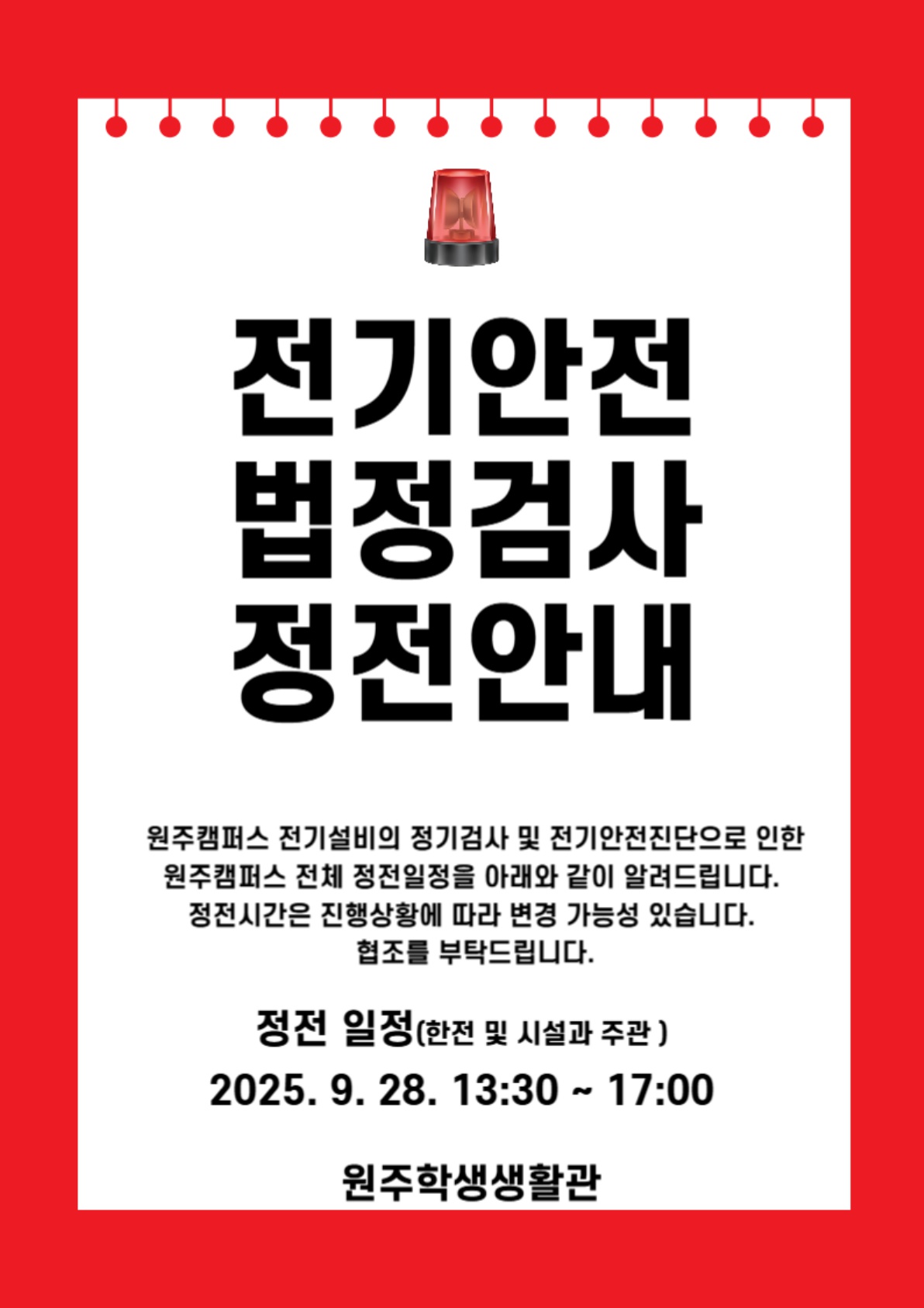 원주캠퍼스 전체 전기안전법정검사 정전 안내(25.9.28.(일))